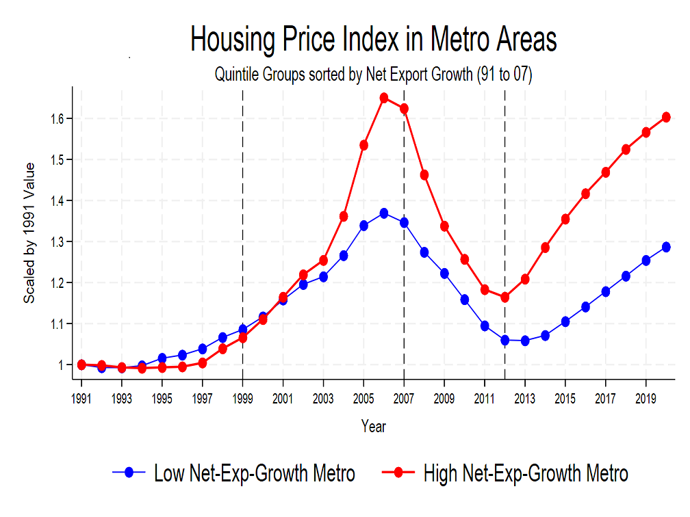 During the 1999-2009 U.S. housing cycle, two opposing empirical facts present a puzzle: the correlation between income growth and mortgage growth is negative across ZIP codes within metropolitan areas (some argue for the ‘credit expansion’ view) but positive across metropolitan areas (others argue for the ‘speculation’ view). First, I show that the cross-metropolitan phenomenon, in fact, is also consistent with the ‘credit expansion’ view: by an instrumental variable approach, I show that net export growth across metropolitan areas causes both income growth and credit expansion in mortgage growth, which eventually leads to the housing cycle. I also design five tests with detailed measures to show that credit expansion rather than speculation plays the dominant role. Second, I develop a new theoretical model that, for the first time in the literature, reconciles the above two seemingly opposing empirical facts in the ‘credit expansion’ view. Third, my theoretical model generates new predictions of ‘double differences’ in the literature: the differential stronger boom and bust cycle in mortgages (and house prices) in low-income ZIP codes than in high-income ZIP codes within metropolitan areas is more pronounced in high net-export-growth metropolitan areas. I provide empirical causal evidence for these new predictions, further supporting the ‘credit expansion’ view.